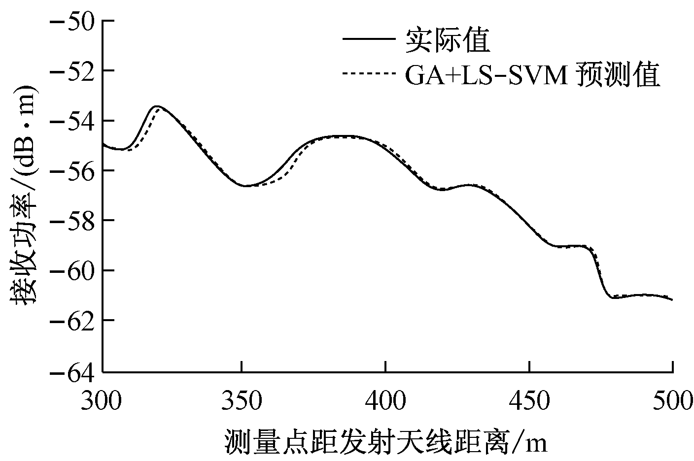 仿真实验中遗传算法的参数设置如下:种群数为50,进化最大迭代次数为200,交叉概率为0.25,变异概率为0.005,采用二进制编码。利用遗传算法求解得到γ= 6.633 19,σ= 0.301 361,将参数代入式(4)可以求得α和b,并得到预测输出。图4给出了经GA优化的LS-SVM的井下场强预测的实际值与预测值曲线,可以看出使用该算法的预测值和实际值的契合度较好。