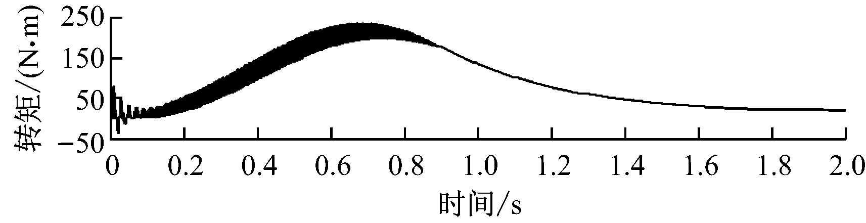 对比几种常见软启动方式的仿真波形(图5—图7)可以看出,直接启动方式所需要的稳定时间最短,约为0.9 s,最大启动电流可达100 A,为额定电流的3~4倍,稳定电流为15 A,转矩脉动较大,波动范围为0~800 N·m;斜坡电压启动所需要的稳定时间最长,约为7.5 s,最大启动电流达30 A,稳定电流为15 A,启动转矩和转矩脉动都较小,波动范围为-50~50 N·m;限流软启动能有效限制启动电流,使之平稳增长,稳定电流为15 A,所需要的稳定时间介于直接启动和斜坡启动之间,约为1.8 s,但启动转矩较小,转矩脉动较大,波动范围为-50~250 N·m。