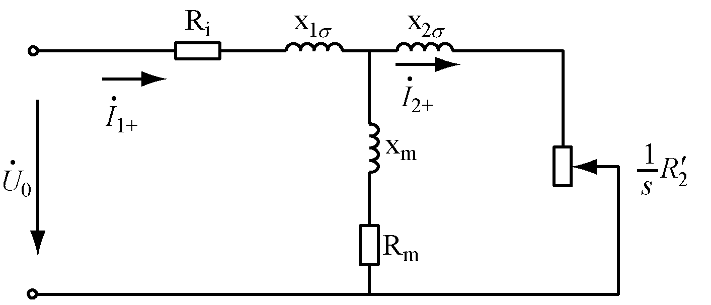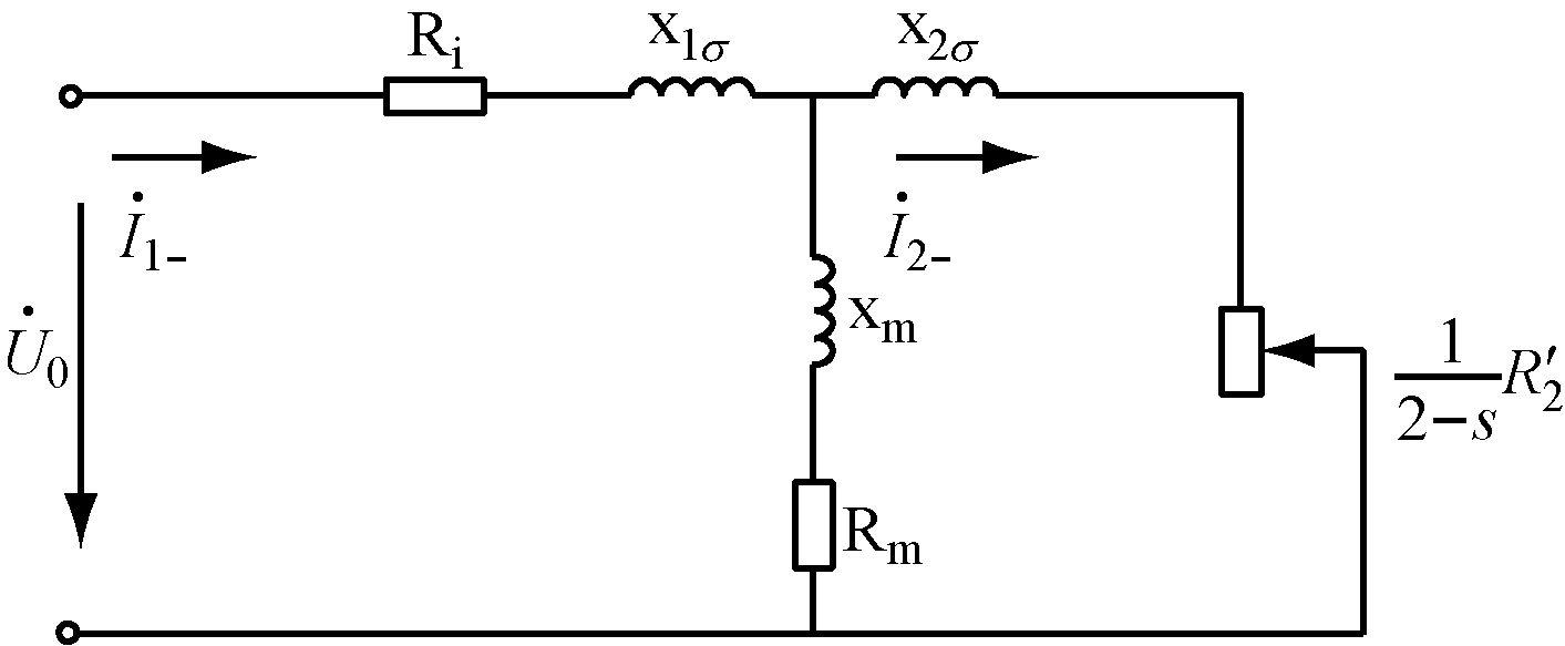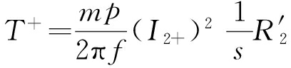 三相异步电动机在不对称电源下运行时,零序分量对电动机的转矩无影响,因此,仅需考虑正序分量和负序分量即可。电动机正序、负序等效电路如图2所示。2个分量所产生的转矩经过矢量合成后,即为不对称电源下电动机的转矩。