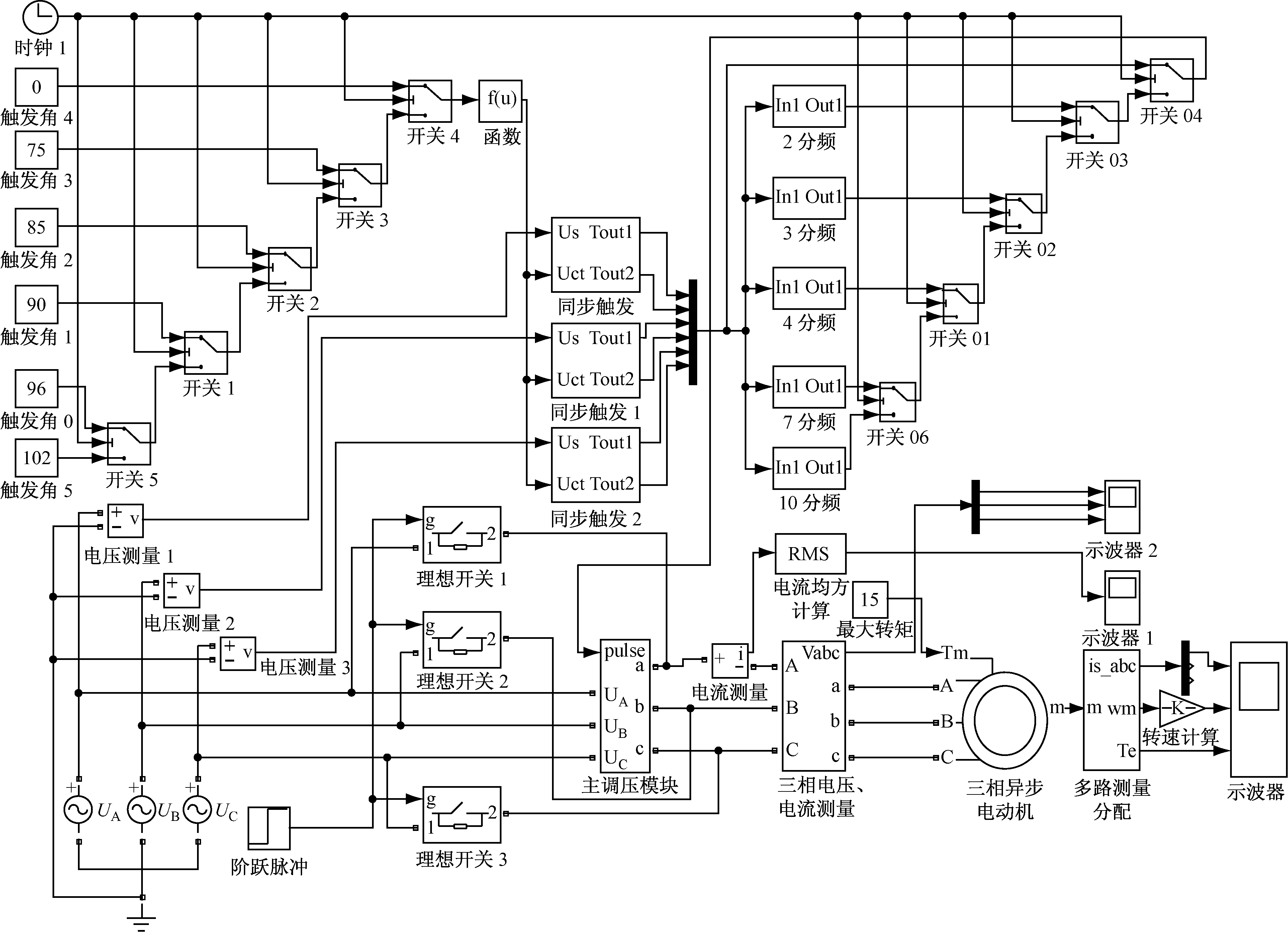 从以上分析可以看出,目前对离散变频技术的研究主要集中在通过改变晶闸管的触发策略和相位角等来达到提高启动转矩、降低启动电流的目的,而对调压电路的组成及电路保护等的研究不是很多。因此,本文在保护电路和调压主电路的组成等方面进行了改进。调压电路采用全控型晶闸管GTO来代替原有的可控硅晶闸管,保护电路用理想型开关组代替三相断路器来控制GTO晶闸管的导通和关断,当电路中出现过电压或过电流时,可以迅速闭合开关,将调压电路分离出来,从而可以避免过电压或过电流对电路造成损害,达到保护电路的目的。通过分析分频电压的相序及最佳初相角的组合,确定了能够使输出转矩最大的最佳相位角,并选定了分级启动的各个子频率,最后通过Matlab仿真模型验证了改进后的软启动方式不仅能降低启动电流,增大启动转矩,还能有效保护电路。