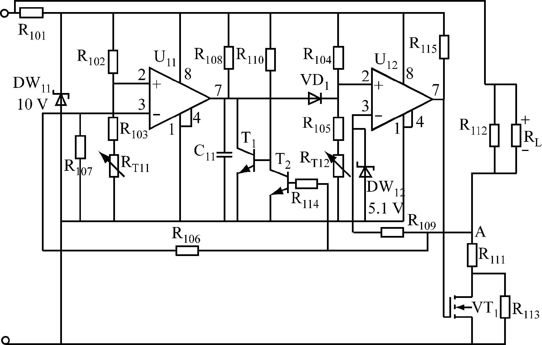 新型截流型保护电路采用的双重化并联控制结构是完全对称的,当其中一个控制回路不能工作时,另一个控制回路仍能保持独立正常工作,大大提高了电路的可靠性。限于篇幅,本文只分析其中1路,如图2所示,其中电压比较器U11,U12采用LM311,三极管T1,T2采用2N5551,开关管VT1采用IRF3710S Power MOSFET(导通电阻为0.02 Ω);稳压管DW11,DW12的稳定电压分别为10,5.1 V,R111为阻值为0.1 Ω的检测电阻,R112阻值为10 kΩ, R113阻值为600 Ω,RL为负载。