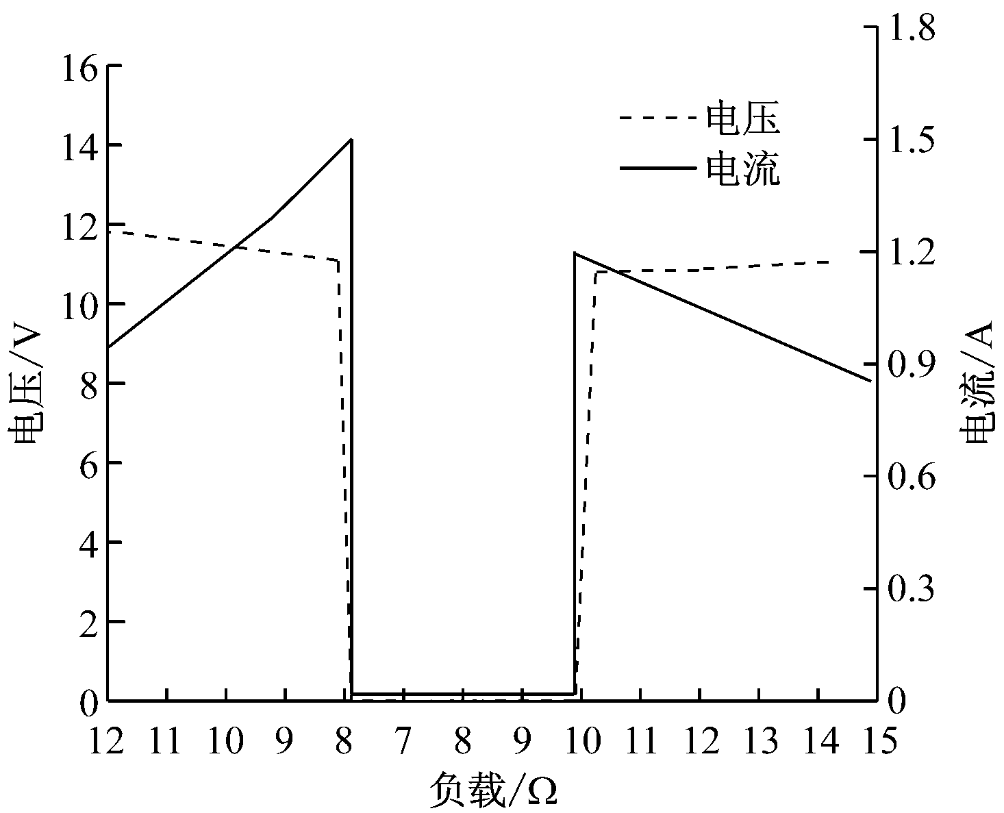 负载阻值大于9.9 Ω、负载电流小于1.21 A时重新开启。负载效应仅为1.3%,电源能够输出稳定电压,带载能力较强。
