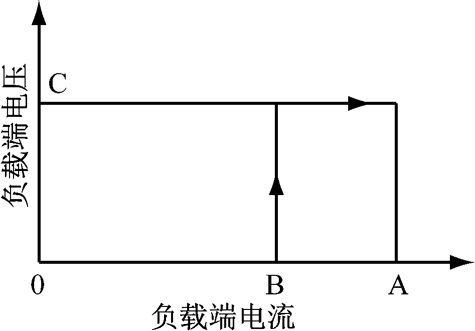 新型截流型保护电路是输出电阻变化的电路。当负载变大或短路后,负载电流大于设定的截止电流A,检测电路通过取样电阻将负载电流转换成电压,通过电压比较器比较,反馈到控制端,使开关管关断,负载被迅速截流,输出电压接近0[2]。当开关管关断后,检测电路检测到负载没有过流(即负载电流小于设定的关断恢复电流B),迅速启动电路,使电路恢复正常,保证正常输出。图1为新型截流型保护电路工作原理,其中A点为截止点,B点为关断恢复点,C点为空载时负载端电压。
