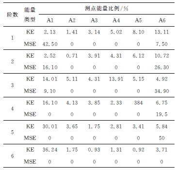 1—6阶模态各测点能量比例见表1,考虑到模型对称性,只列出(i=1∶6)点数值。