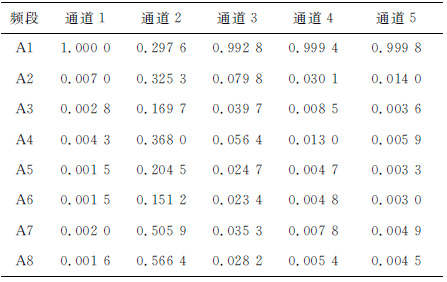 对采煤机截割臂的振动加速度信号进行小波包分解,得到的3个测点振动加速度信号的频带能量,见表4,各个频带的归一化数值见表5。