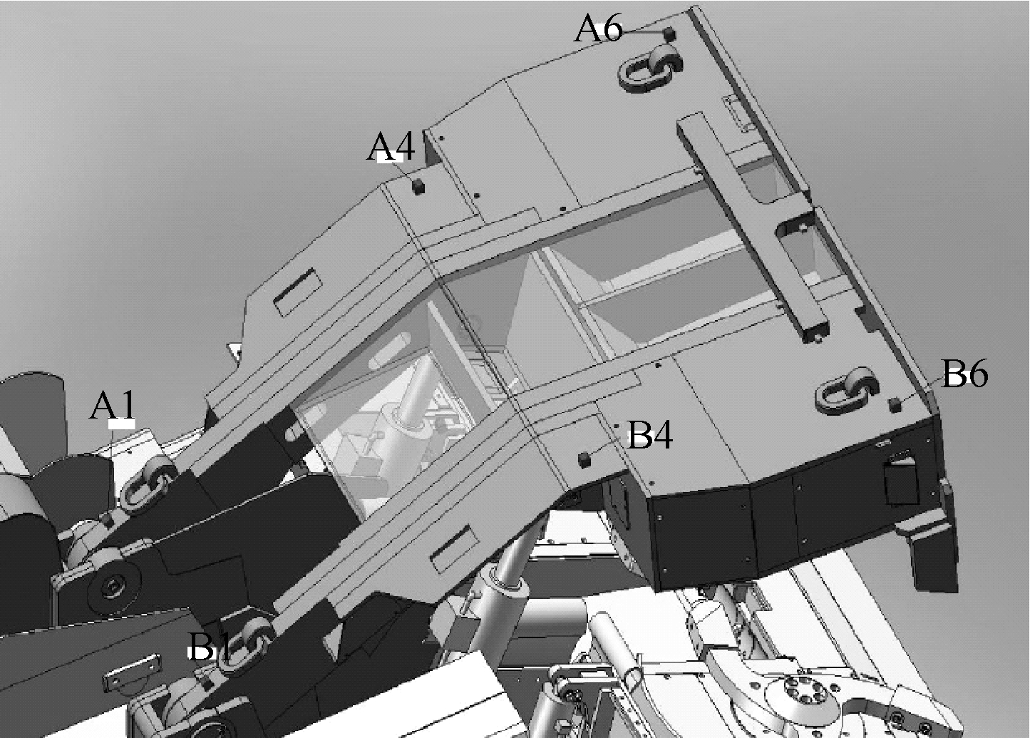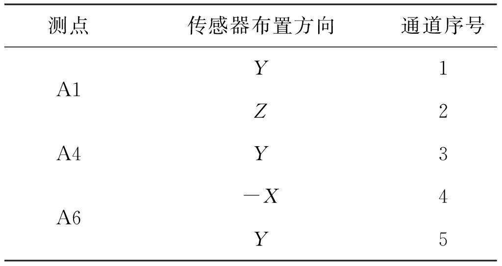 累计表1中各测点的能量百分比之和,就模态运动能而言,所占比例从大至小的测点分别是A1、A6、A4、A5、A3、A2;就模态应变能而言,测点A1、A4及A6最重要。以模态运动能结果为主要评价标准,模态应变能结果为辅助参考,选取A1、A4、A6及对称测点B1、B4、B6来布置传感器,如图4所示。最终传感器布置方向和通道序号见表2。因截割臂结构为对称结构,故取A1的Y方向和Z方向、A4的Y方向、A6的-X和Y方向布置传感器。