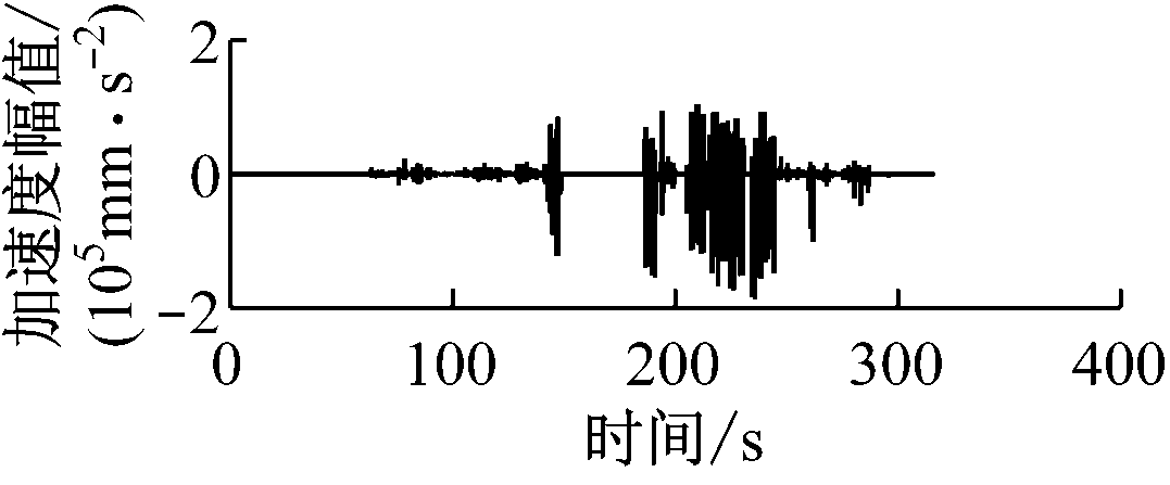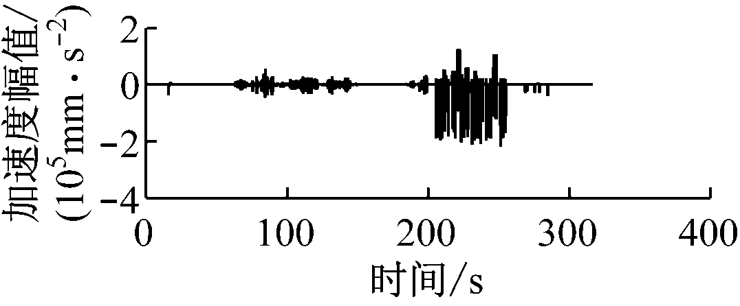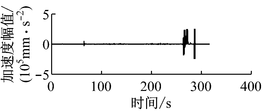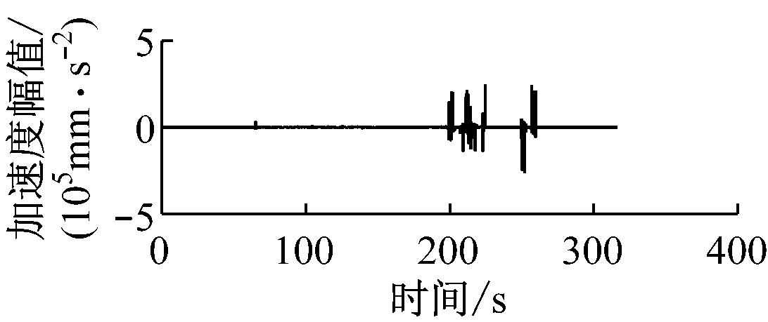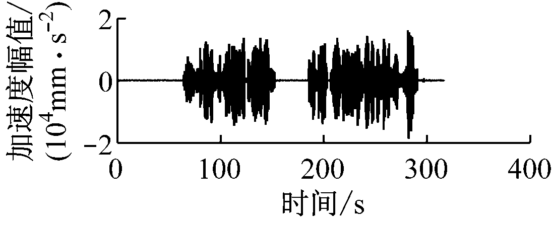本文通过畸点消除和巴特沃斯滤波对所得到的加速度振动信号进行预处理,此外,为了方便对信号进行分析,常常假设测得的随机数各态历经[8],最终得到加速度时域波形,如图5所示。
