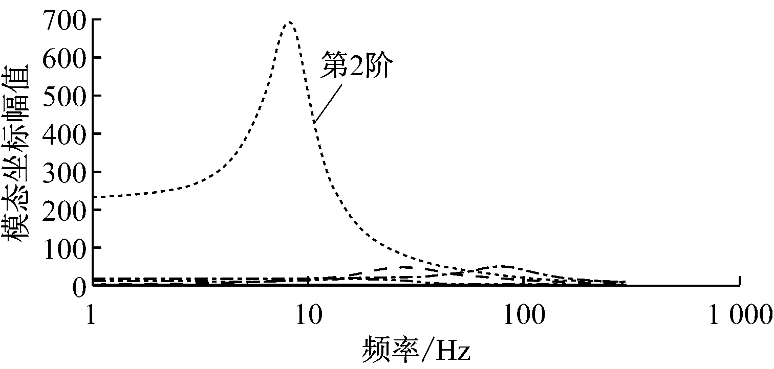 截割滚筒截割过程中受到低频激励。通过分析前6阶的模态坐标可得,第2阶模态所占比例最大,如图3所示。该阶模态振型表现为截割臂和滚筒上下摆动,与实际过程中受载情况一致。
