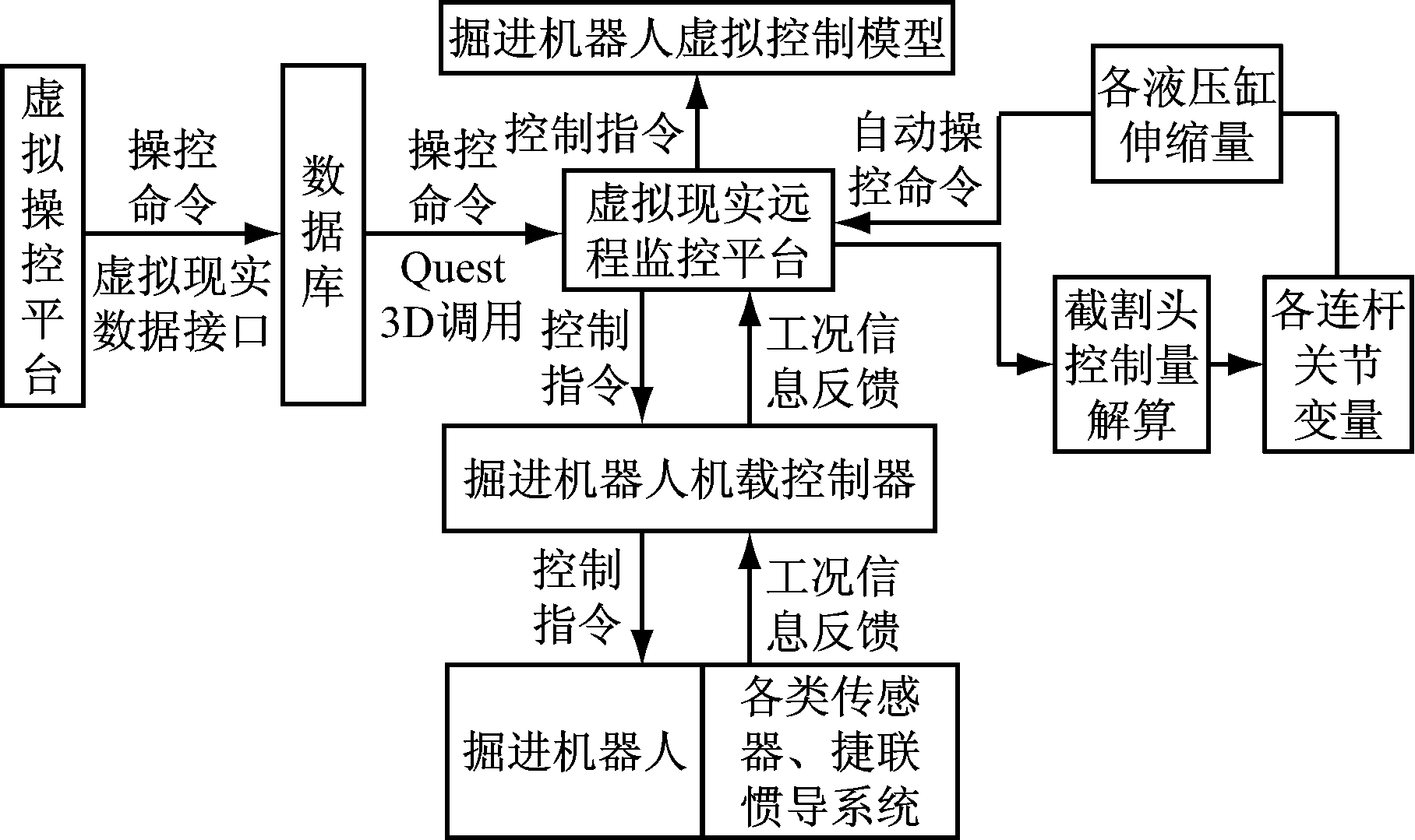 虚拟操控平台发送控制指令,控制信号由高速数据采集卡和虚拟现实数据接口进行采集并分类存入数据库。在虚拟现实远程监控平台中,Quest 3D虚拟现实软件程序读取数据库中的控制指令,将其通过通信总线发送给掘进机器人机载控制器,以驱动井下掘进机器人运动。同时,虚拟操控平台控制指令驱动虚拟掘进机器人运动,实现虚拟掘进机器人与井下掘进机器人同步动作。掘进作业时,虚拟现实远程监控平台按照巷道界面和截割头尺寸等编制截割轨迹,对截割头控制量进行解算,求解出各连杆关节变量,确定各液压缸伸缩量。虚拟现实远程监控平台将各液压缸伸缩量控制指令发送给掘进机器人机载控制器和虚拟现实远程监控平台中的虚拟掘进机器人,实现掘进机器人的自动控制。机载控制器采集掘进机器人位姿和工况状态数据,对数据进行处理后通过通信总线发给虚拟现实远程监控平台,利用数据库对各类传感器和捷联惯导系统[5]数据进行归档整理、存储。虚拟现实远程监控平台实时读取并处理数据库中存储的掘进机器人位姿工况数据,以此修正井下掘进机器人的位姿,显示掘进机器人的真实运行状态,为掘进机器人远程监控提供决策依据。