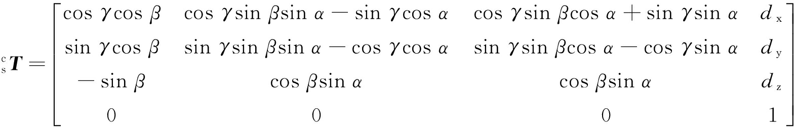 机身传感器安装在机体上的位置是已知的,则cT为已知量,传感器测得的掘进机器人机体相对于测量坐标系的位置记为(dx,dy,dz),掘进机器人机体绕测量坐标系3个轴的相对姿态角为(α,β,γ)。掘进机器人机体相对测量坐标系的齐次变换矩阵为