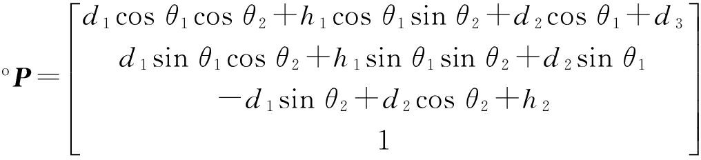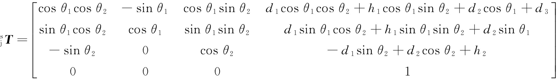 式中:d1为X方向截割头中心点Oj与摇臂中心点Oy间的距离;d2为X方向摇臂中心点Oy与回转台中心点Oh间的距离;d3为X方向回转台中心点Oh与机体中心点Os间的距离;h1为Z方向截割头中心点Oj与摇臂中心点Oy间的距离;h2为Z方向回转台中心点Oh与机体中心点Os间的距离;θ1为回转台坐标系OhXhYhZh绕机体坐标系OsXsYsZs中Z轴的旋转角;θ2为摇臂坐标系OyXyYyZy绕回转台坐标系OhXhYhZh中Z轴的旋转角。