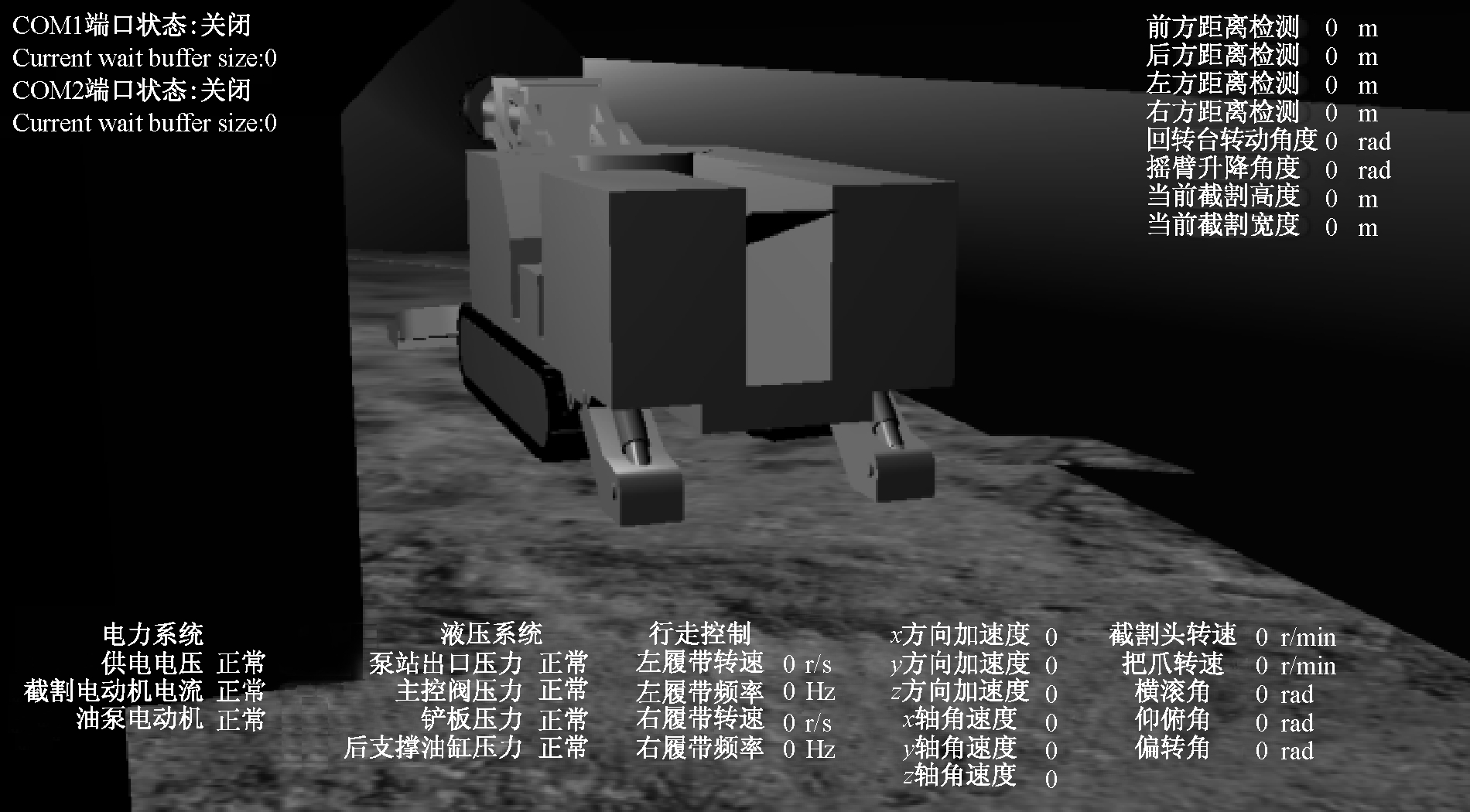 人机交互界面用于显示掘进机器人工况参数、工作状态和故障报警,为远程操作人员提供数据参考。人机交互界面如图3所示。工况参数显示通过显示窗口显示截割头转数、耙爪转数、截割高度等参数值。工作状态显示通过Quest 3D软件中GUI模块实现,可通过ChannelSwitch来切换不同方位的相机,实现综掘工作面不同角度的观察,还可通过界面上的Button显示掘进机器人摇臂等的工作状态。故障报警是当工况参数超过警戒值时发出报警声,使掘进机器人停止作业。