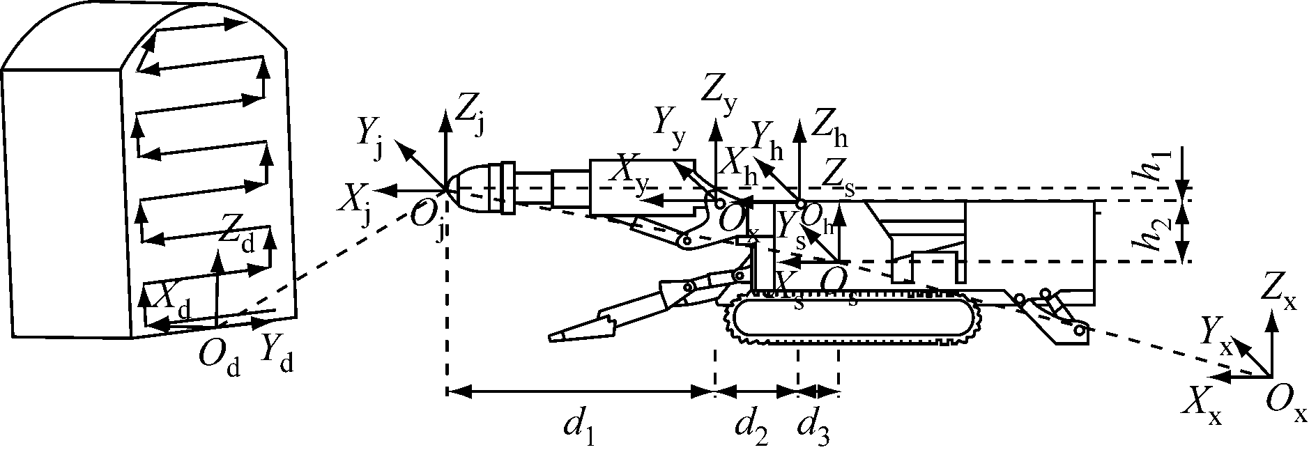 由于综掘工作面采用相对定位法,需要定义6个坐标系,即掘进机器人机体坐标系OsXsYsZs、巷道断面坐标系OdXdYdZd、巷道坐标系OxXxYxZx,摇臂坐标系OyXyYyZy,截割头坐标系OjXjYjZj、回转台坐标系OhXhYhZh,如图5所示。