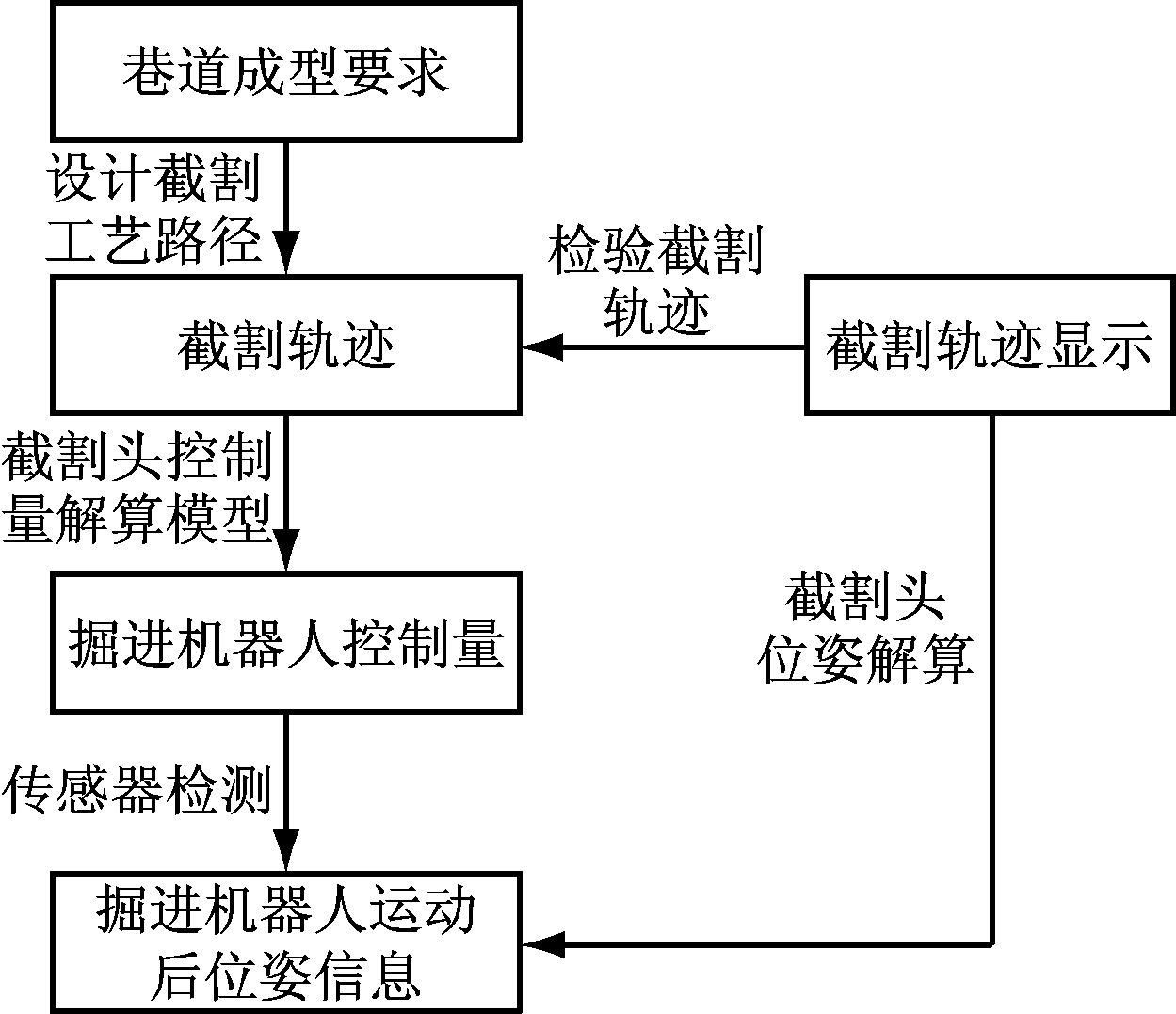 为了达到掘进机器人按照预先设定的轨迹自动掘进的目的,设计了掘进机器人控制流程,如图4所示。首先根据巷道成型要求设计截割工艺路线,确定截割轨迹。然后根据截割点的位置和掘进机器人的位姿,通过建立截割头控制量解算模型得出掘进机器人控制量,利用得到的控制量对掘进机器人进行截割控制。最后利用掘进机器人机身传感器检测掘进机器人运动后的位姿信息,经截割头位姿解算确定截割轨迹并进行显示,以验证截割轨迹是否正确。
