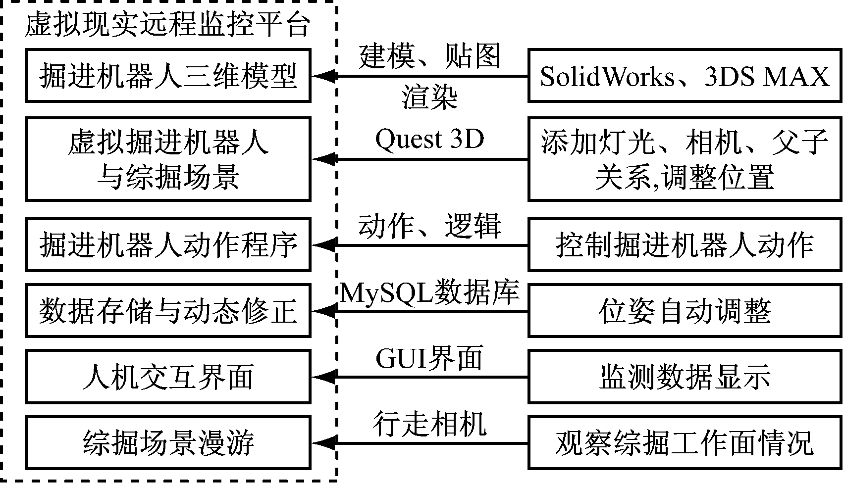 基于Quest 3D 虚拟现实软件开发的掘进机器人虚拟现实远程监控平台主要包括掘进机器人三维模型、虚拟掘进机器人与综掘场景、掘进机器人动作程序、数据存储与动态修正、人机交互界面、综掘场景漫游,如图2所示。