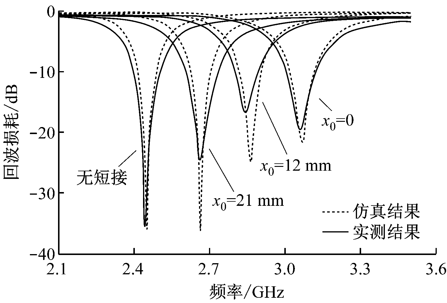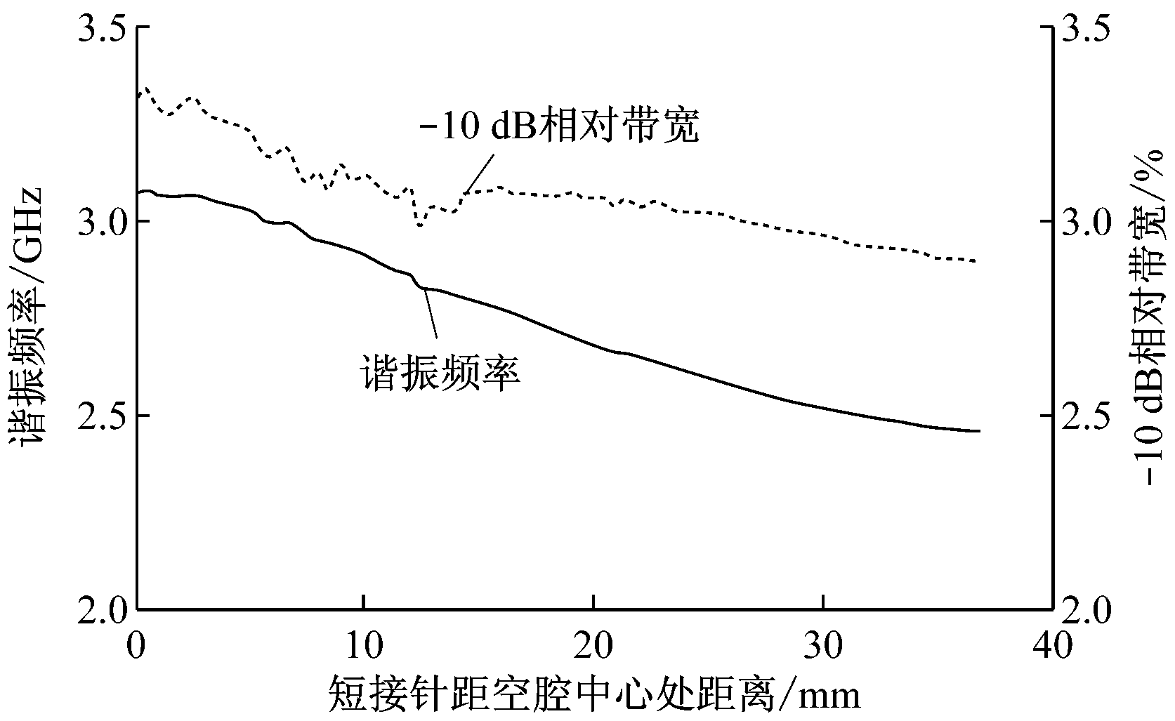 当短接针位置坐标限定为y0=2 mm,0≤x0≤37 mm时,谐振频率和-10 dB相对带宽随x0变化的曲线如图4所示。从图中可看出,随着短接针位置从空腔中心(x0=0)向侧壁靠近,谐振频率近似线性下降,相对带宽保持缓慢下降。通过调整短接针的位置,可以得到2.45~3.07 GHz的谐振频率调节范围。