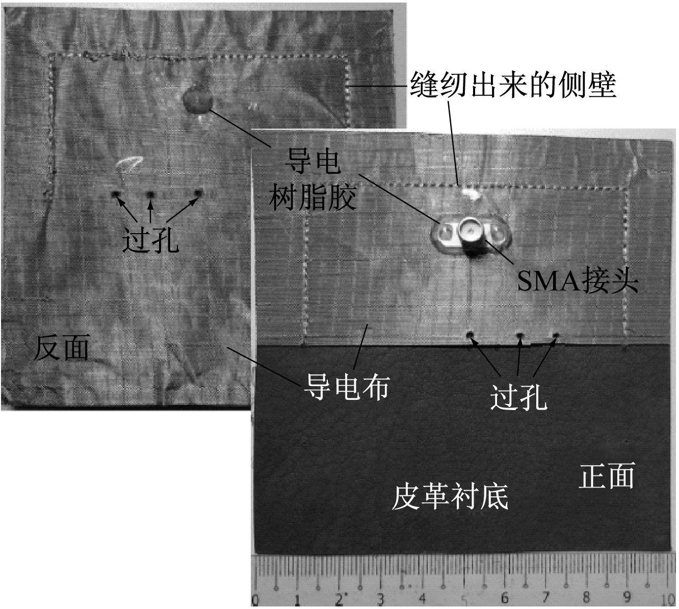 按照设定的各项尺寸,制作了如图6所示的天线实物。使用标准SMA接头来形成馈电探针并提供50 Ω的标准阻抗。在馈电探针与空腔顶壁、SMA接头底座与底面的连接处使用导电树脂胶以保证导通,这是因为焊接的方式会损坏导电布。