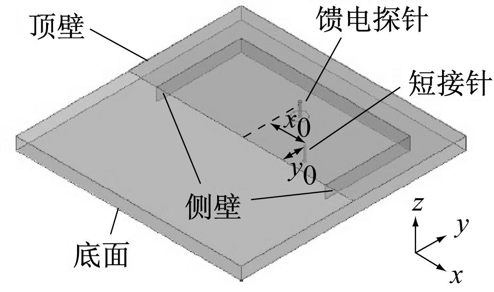 天线工作状态由阻抗匹配情况确定,因此在天线阻抗发生变化时,其对应的工作频段也会发生偏移,甚至会发生阻抗不匹配(失配)的情况。对于贴片天线,在贴片和底面之间增加短接针是常见的通过改变天线阻抗调整工作频段的方法。半模衬底集成空腔天线同样拥有平面化的结构,故在空腔内增加短接针同样有可能起到调节谐振频率的作用。因此,对图1中的天线结构进行调整,在空腔内增加直径为1 mm,连接空腔顶壁和底面的短接针,如图2所示,其中x0,y0分别为短接针距空腔中心和空腔开口处的距离。