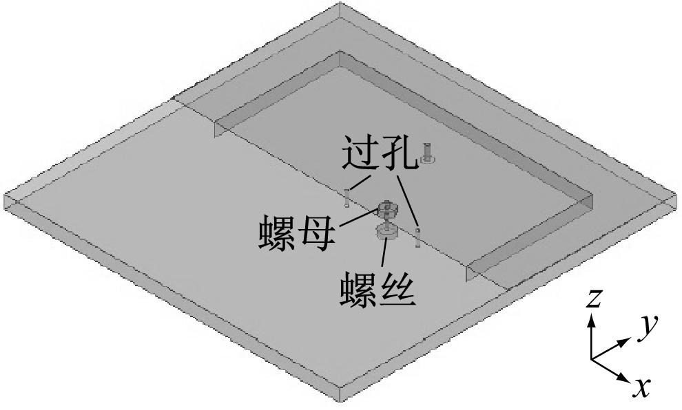 为验证多频切换设计的可行性,选择2.45 GHz(无短接针)、2.66 GHz(短接针位置为x0=21 mm,y0=2 mm)、2.86 GHz(短接针位置为x0=12 mm,y0=2 mm)和3.07 GHz(短接针位置为x0=0,y0=2 mm)4个谐振频率,在后3个谐振频率对应的短接针位置打直径约1 mm的过孔,使用相同直径的金属螺丝来代替短接针,并利用螺母实现螺丝的安装、拆卸,多频切换半模衬底集成空腔天线结构如图5所示。