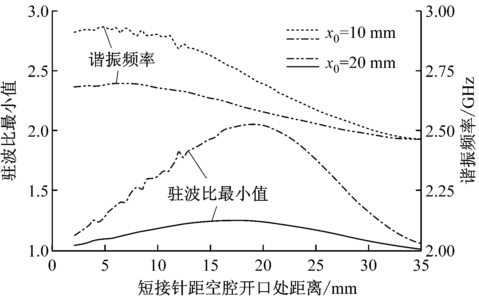 当x0=10,20 mm时,驻波比最小值和谐振频率随y0变化的曲线如图3所示。从图中可看出,当短接针靠近空腔开口或侧壁时,天线阻抗匹配最佳。但当短接针靠近侧壁时,谐振频率趋向于未加短接针的情况,不利于调节频率。这是因为在侧壁附近场强很弱,加短接针几乎不会对天线阻抗产生影响。因此,在靠近空腔开口处添加短接针既能调节频率,又能保证天线阻抗匹配。