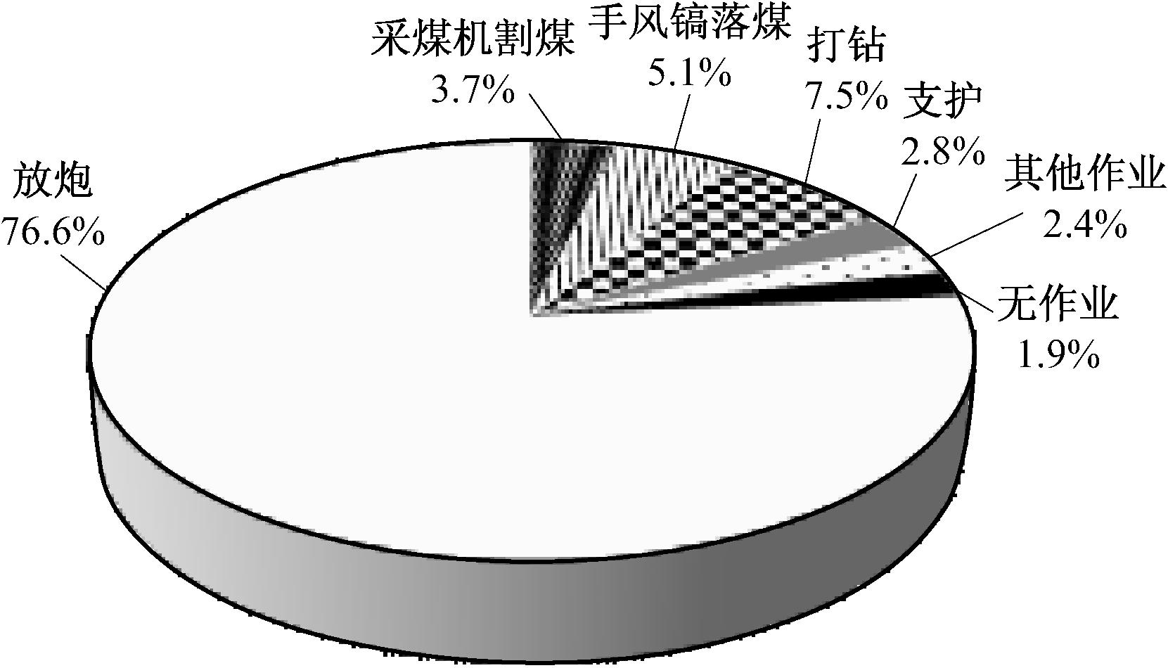对煤与瓦斯突出事故发生前的突出地点作业方式进行统计:因放炮导致的突出164起,占76.6%;采煤机割煤导致的突出8起,手镐及风镐落煤导致的突出11起,打钻导致的突出16起,支护导致的突出6起,其他作业方式导致的突出5起,共占21.5%;无作业方式导致的突出4起,占1.9%。贵州矿区煤与瓦斯突出事故作业方式统计如图3所示。可看出作业方式是突出最重要的影响因素;在这些作业方式中,放炮是诱导煤与瓦斯突出的主要因素。
