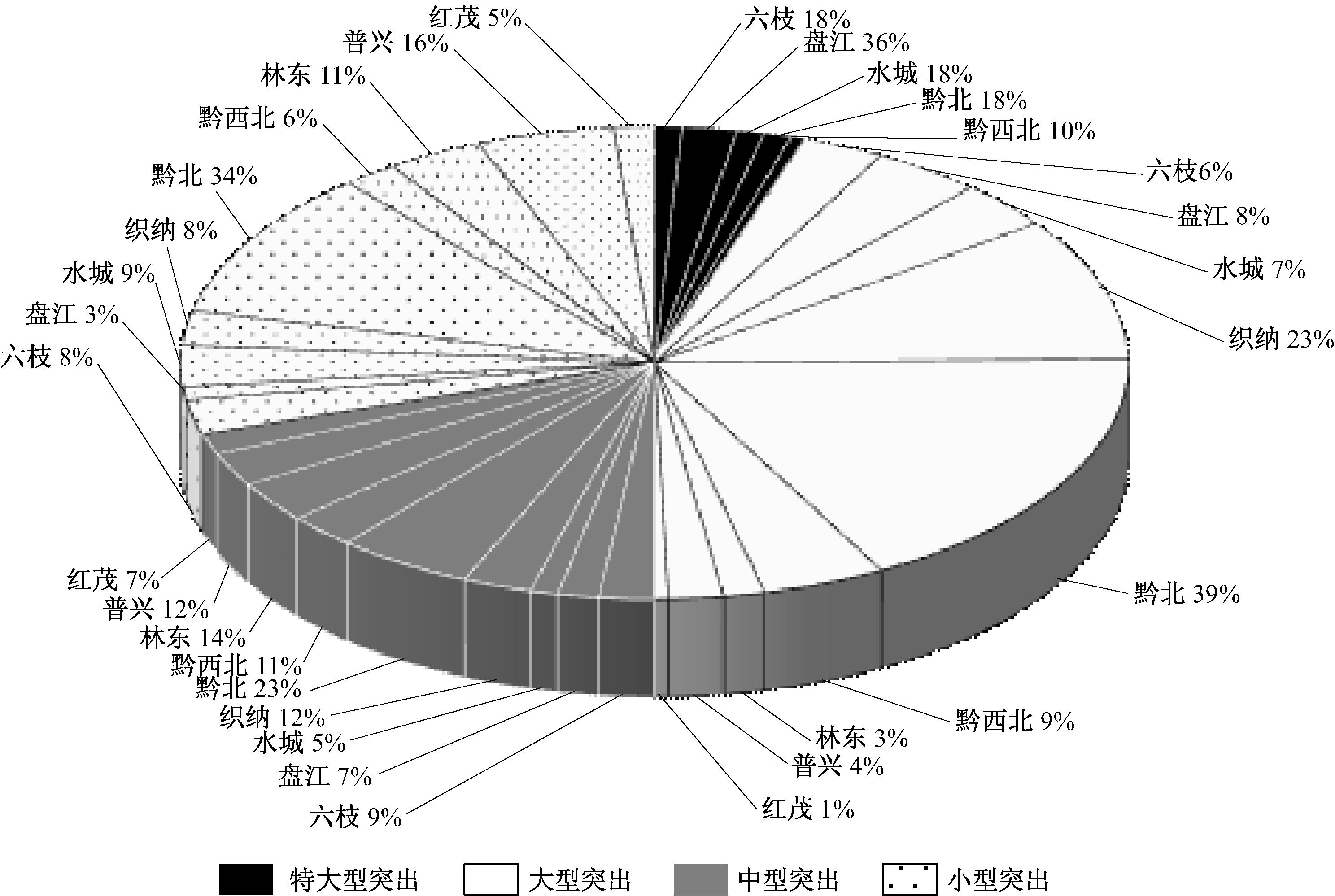 对煤与瓦斯突出事故的突出强度进行统计:小型突出事故64起,占29.9%;中型突出事故43起,占20.1%;大型突出事故96起,占44.9%;特大型突出事故11起,占5.1%。贵州矿区煤与瓦斯突出事故强度分布统计如图1所示。特大型突出事故较少发生,主要发生在六枝、盘江、水城、黔北和黔西北矿区;大型突出事故在黔北、织纳矿区发生得较多;中型突出事故在各个矿区分布较为均衡;小型突出事故除黔北矿区外在其他各个矿区分布也较为均衡。其中黔北矿区发生的煤与瓦斯突出事故最多,为71起,多为大型和小型突出事故。