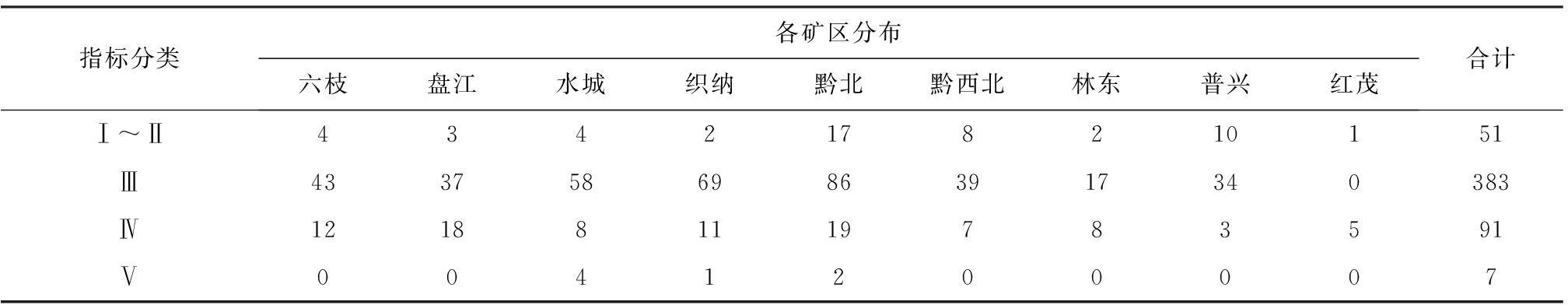 煤的破坏类型在各矿区的分布情况见表4。可以看出贵州煤层的破坏程度较大,煤的破坏类型主要集中在Ⅲ~Ⅳ类(占89%),其中以Ⅲ类居多(占72%),Ⅰ~Ⅱ,Ⅴ类占的比例很小;Ⅰ~Ⅳ类煤在各个矿区均有分布,水城、织纳和黔北矿区煤的破坏程度较大,均有Ⅴ类煤分布。