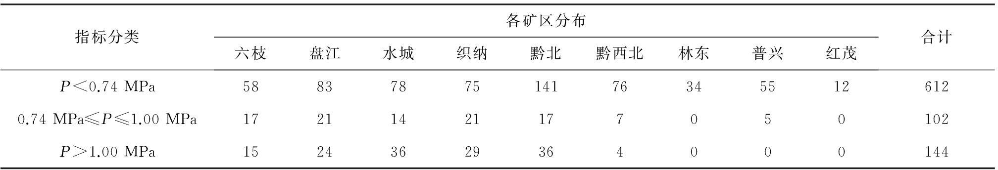 煤层瓦斯压力是决定煤层瓦斯含量和煤层瓦斯动力学特征的基本参数。煤层瓦斯压力在各矿区的分布情况见表1。P<0.74 MPa的有612组,占71%,这是由于大多矿井的开采深度较浅,测得的煤层瓦斯压力相对较小;P≥0.74 MPa的有246组,占29%(其中0.74 MPa≤P≤1.00 MPa的占12%,P>1.00 MPa的占17%),除林东和红茂矿区外其他矿区均有分布,可看出贵州煤层瓦斯压力偏大,突出风险较大;P>1.00 MPa的主要分布在水城、黔北、织纳、盘江和六枝矿区,这些矿区也是突出事故最严重的区域,而林东、普兴和红茂矿区煤层瓦斯压力均不大于1.00 MPa。
