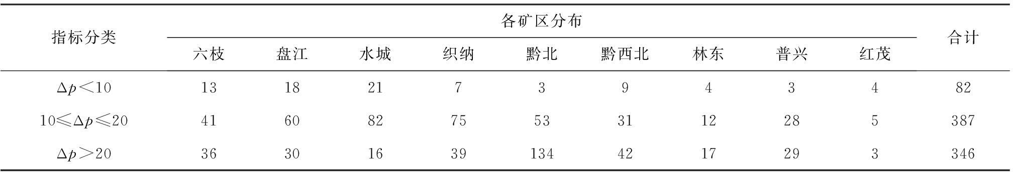 通过收集贵州省九大矿区381对矿井、695层煤的煤与瓦斯突出指标,现场共测得煤层瓦斯压力(P)858组;采集煤样在实验室测得瓦斯放散初速度指标(Δp)815组;煤的普氏系数(f)809组;在井下各煤层暴露点判定煤的破坏类型532组。