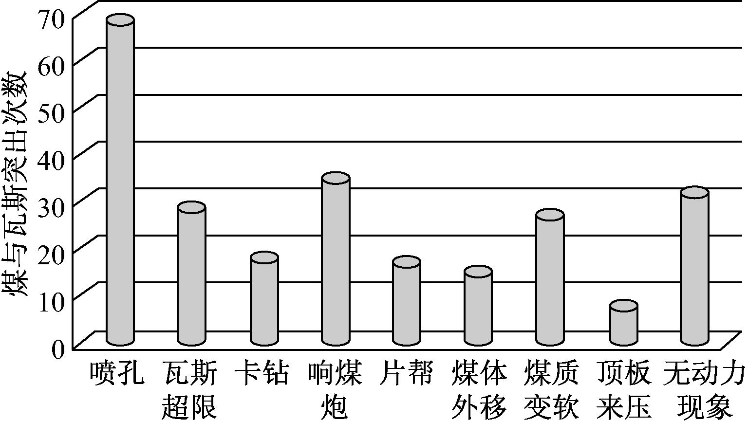 对煤与瓦斯突出事故发生前的动力现象进行统计:发生过喷孔、响煤炮、卡钻、瓦斯超限、煤质变软、片帮、煤体外移及顶板来压等动力现象的突出182起(有相当一部分突出发生2次及2次以上动力现象),占85%;无动力现象的突出32起,占15%。贵州矿区煤与瓦斯突出事故动力现象统计如图4所示。
