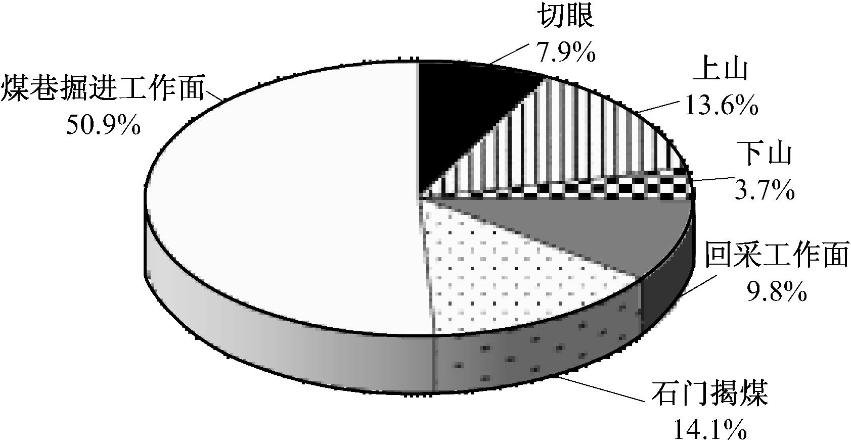 对煤与瓦斯突出事故发生处的巷道类型进行统计:17起发生在切眼处,占7.9%;29起发生在上山处,占13.6%;8起发生在下山处,占3.7%;21起发生在回采工作面,占9.8%;30起发生在石门揭煤处,占14.1%;109起发生在煤巷掘进工作面,占50.9%。贵州矿区煤与瓦斯突出事故巷道类型统计如图2所示。可看出贵州矿区煤与瓦斯突出事故主要发生在煤巷掘进工作面;上山比下山更易发生煤与瓦斯突出。