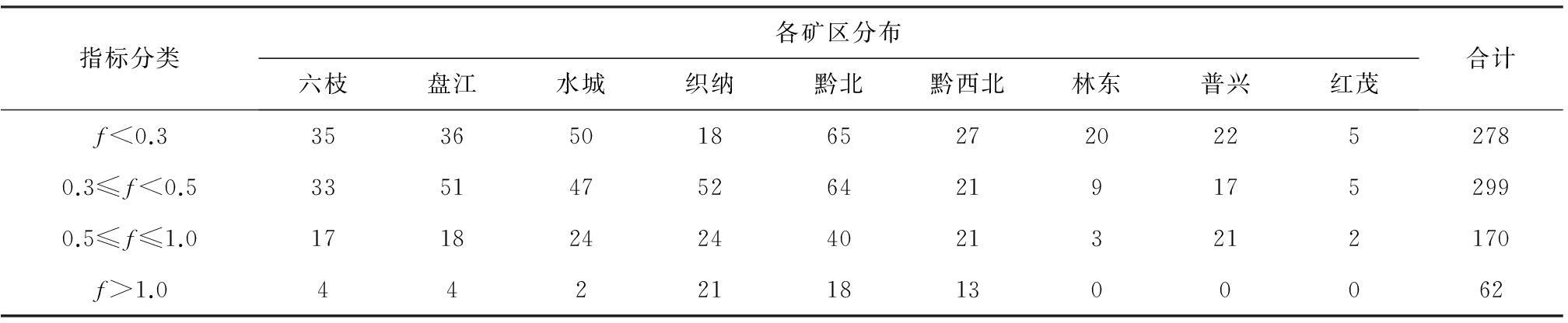 煤的普氏系数是表示煤抵抗外力破坏能力的一个综合指标,煤的普氏系数越小,发生煤与瓦斯突出的可能性越大[5]。煤的普氏系数在各矿区的分布情况见表3。可以看出六枝、盘江和水城矿区煤的普氏系数较小,大多小于0.5,大于1.0的极少;织纳、黔北和黔西北矿区煤的普氏系数从小于0.3到大于1.0均有分布,主要原因是这些矿区煤种为无烟煤,煤质较硬,但煤层遇到构造或存在软分层时,又会变得很软。总体来说贵州煤层偏软,煤的普氏系数小于0.5的就占了71%,且煤的普氏系数分布比较广泛,这与贵州复杂的地质条件有关,特别是软分层的存在,使得煤层时硬时软。