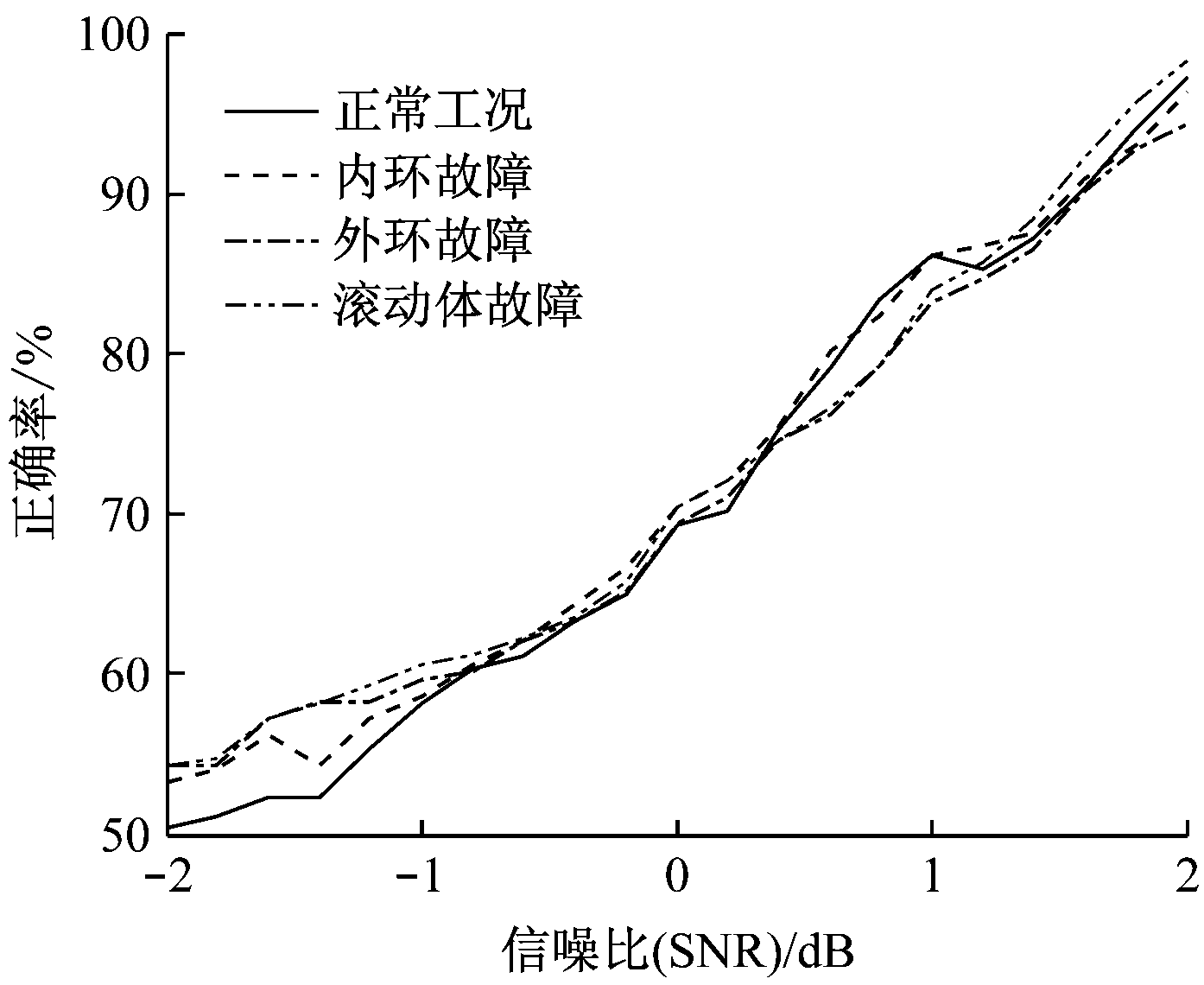 利用本文方法对该4种工况仿真信号进行分析:首先,对每种仿真信号加入信噪比(SNR)为-2~2 dB的高斯白噪声,使每种仿真信号数为50个,用该200个信号构成训练字典;其次,利用离散傅里叶变换将每个信号转换至频域;最后,随机选择其中任一信号在训练字典上进行稀疏分解,并进行重构,找出重构误差最小的故障类别,即为该信号所属的故障类型。每种仿真信号试验30次,取其正确率的平均值作为最后的识别率,其结果如图2所示。
