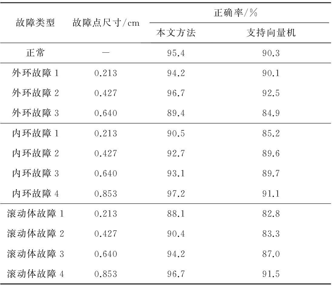 由表1可以看出,利用本文方法和支持向量机方法的设备轴承故障诊断数据集分类正确率都在80%以上,随着故障点尺寸的增加,诊断正确率也明显增加,故障点尺寸越大,诊断越准确;本文方法在故障点的正确率比支持向量机方法高5%左右。