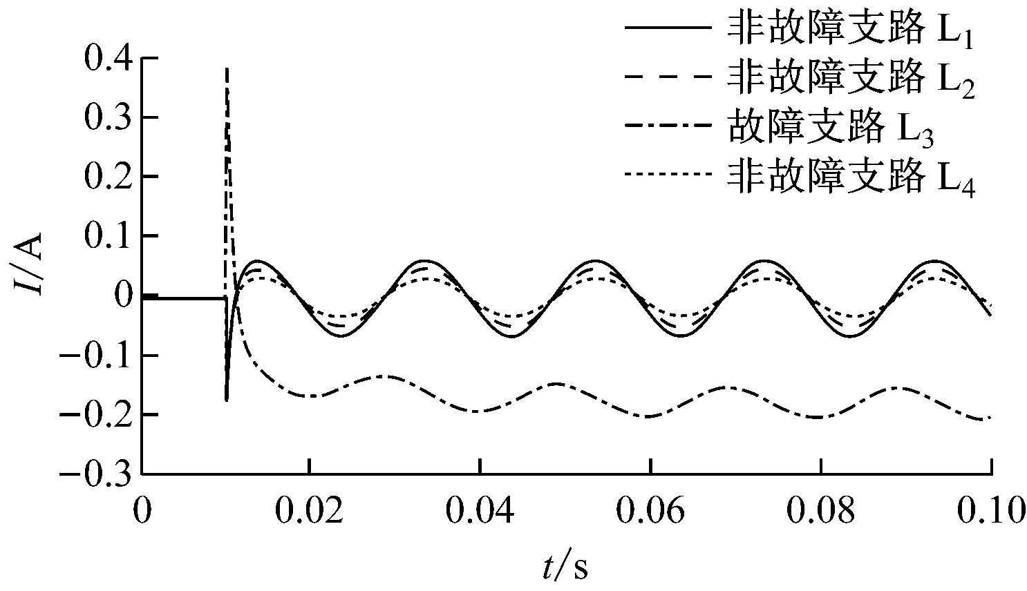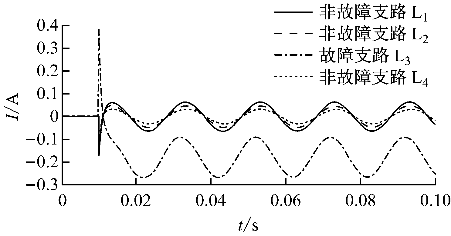 系统在t=0.01 s时发生单相漏电故障,各支路零序电流I波形如图4所示。