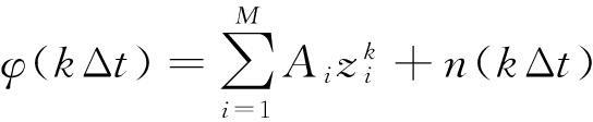 式中:k=0,1,…,n-1;Δt为采样时间间隔;x(kΔt)为真实信号;n(kΔt)为噪声信号;Ai为第i(i=1,2,…,M)个信号的复幅值;Di为第i个信号的衰减因子;ωi为第i个信号的角频率。