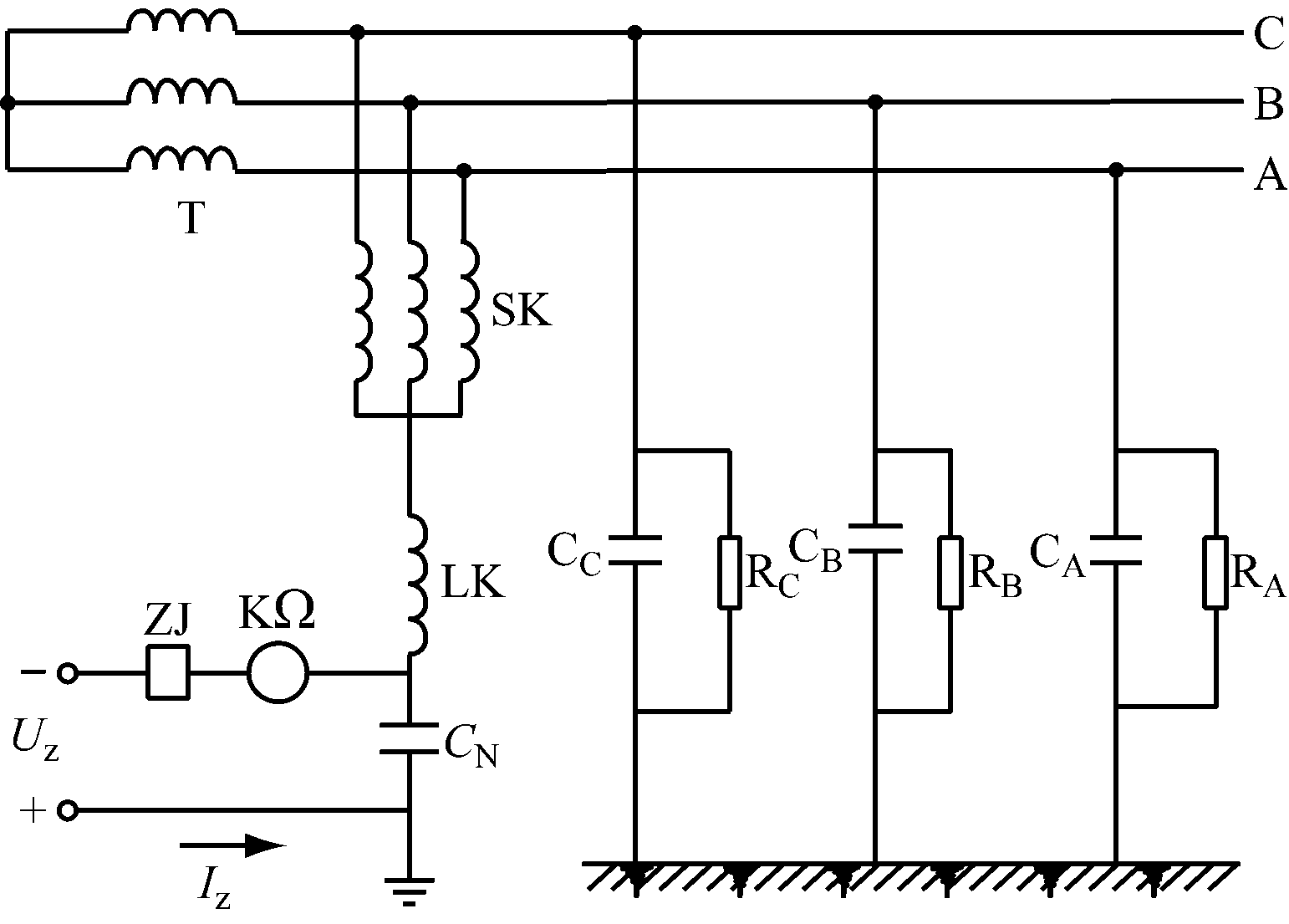附加直流源系统漏电保护原理[9]如图1所示。在变压器T的二次侧采用三相电抗器SK制造人为中性点,连接零序电抗器LK。当系统发生单相漏电故障时,附加直流源Uz所提供的直流电流Iz由其正极经大地、绝缘电阻(RA,RB,RC)、SK、LK流回附加直流源负极,构成回路。可采用千欧表KΩ检测电流,经计算得出电网总的对地绝缘电阻,进而判断是否漏电。ZJ为直流电流继电器,CA,CB,CC为三相对地电容,CN为隔直电容。