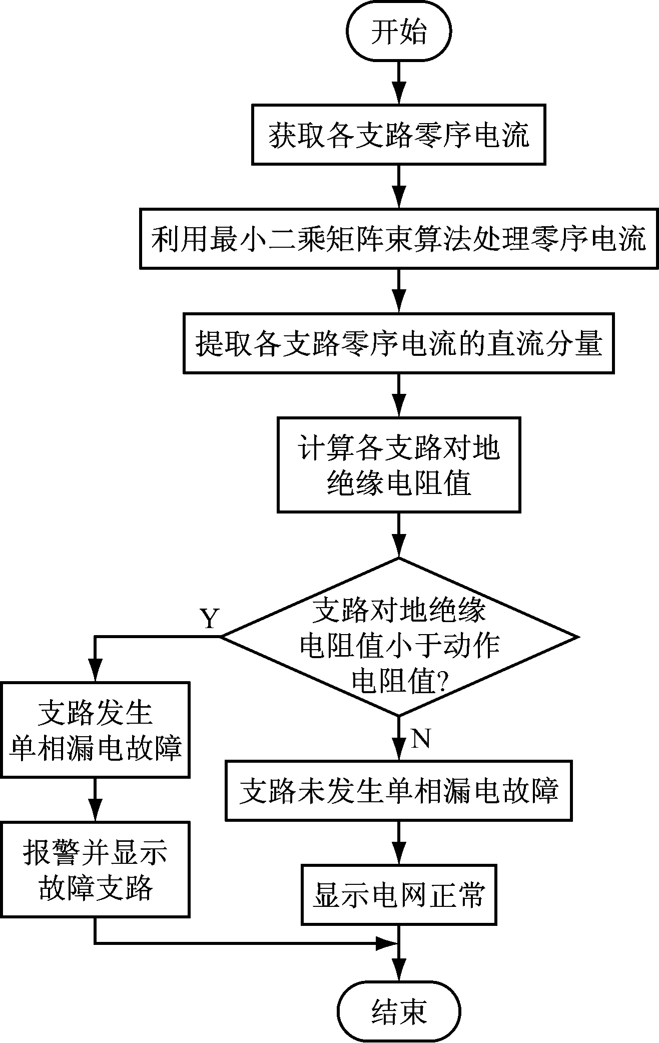 本文在传统附加直流源系统基础上,提出一种漏电保护新方法,即在每条支路上增加1个零序互感器,以获取电网发生单相漏电故障时各条支路的暂态零序电流信号,然后利用最小二乘矩阵束算法提取各条支路暂态零序电流信号中的直流分量,并据此计算各支路的对地绝缘电阻值,将对地绝缘电阻值作为判据[14],判断出故障支路。具体流程如图2所示。