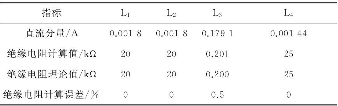 取t=0~0.03 s的数据,根据最小二乘矩阵束算法计算各支路的直流分量,进而得出各支路的对地绝缘电阻值,结果见表1。