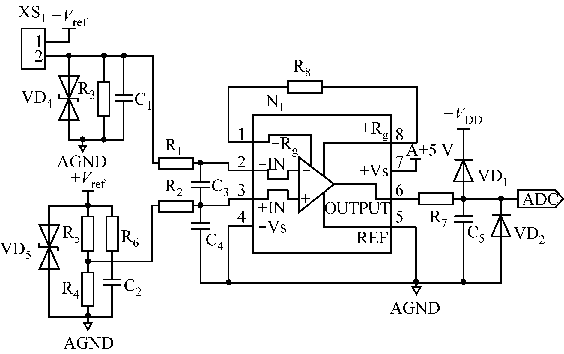 图1中电桥输出的毫伏级差分信号经R1、R2后至运算放大器N1的2、3引脚,理论上N1的2、3引脚的压差为