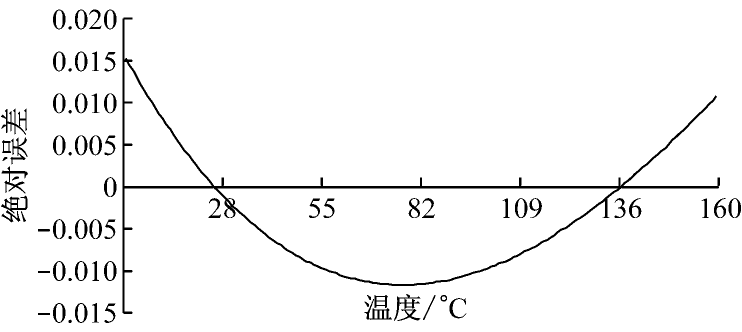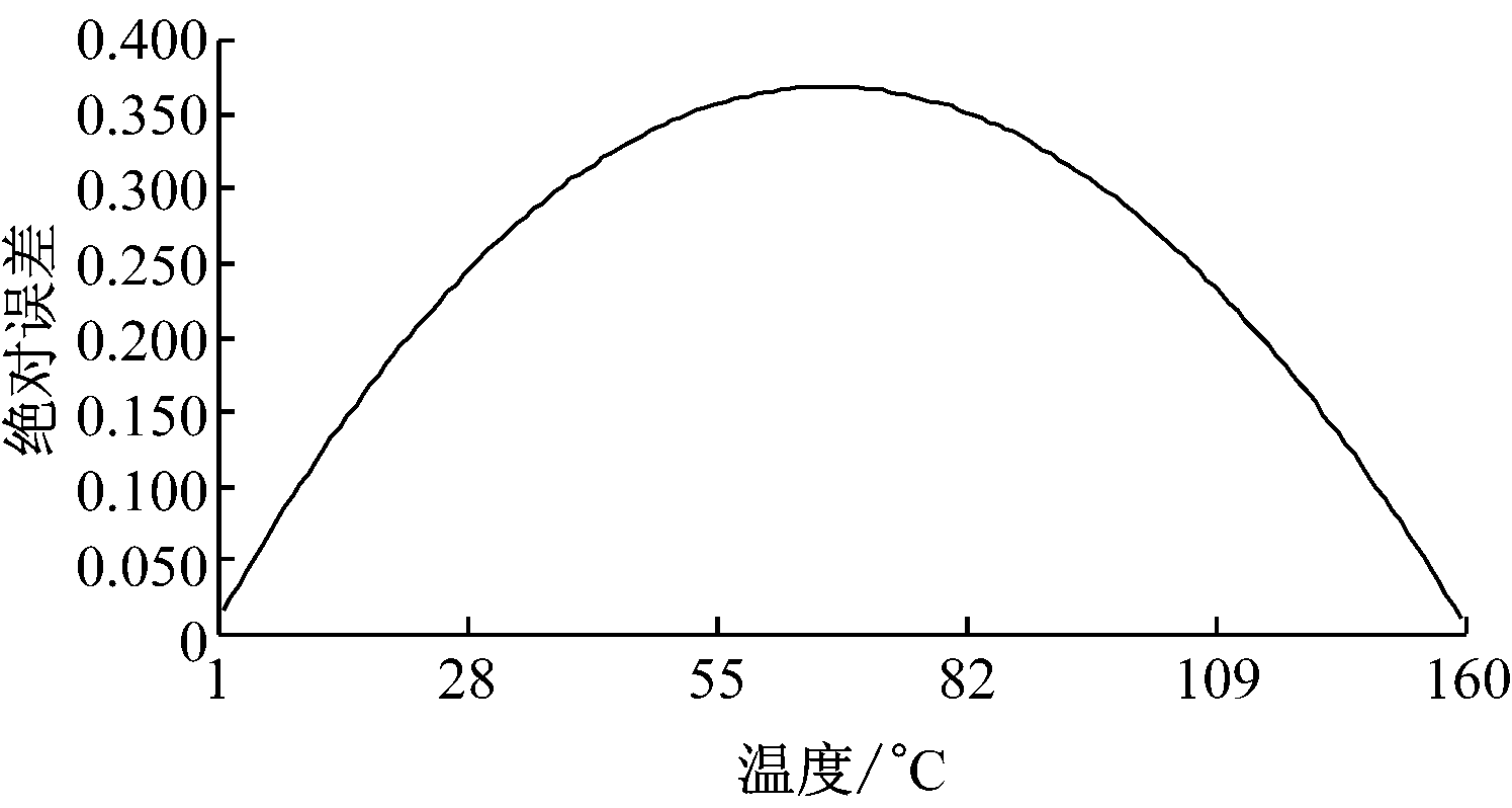 在实际应用中,由式(4)可演变为线性公式来取代理论上的非线性计算方法,达到简便计算的目的,且误差在可控范围之内。取式(4)曲线上零点和满量程两点对应的采样值和电阻值:x=39,y=100.00 Ω(对应0 ℃);x=643,y=161.05 Ω(对应160 ℃)。将两点的值代入线性方程y = kx + b中,可以求出k和b的值:k=0.101 076;b=96.058 03。将k,b代入方程可得