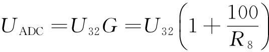 U32差分信号经运算放大电路后转换为单端电压信号UADC,放大倍数G由运放器件外置电阻R8决定。