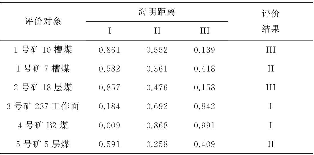 从表3可看出,6个评价对象的最小海明距离分别为0.139,0.361,0.158,0.184,0.009,0.258。可知1号矿10槽煤、1号矿7槽煤、2号矿18层煤、3号矿237工作面、4号矿B2煤和5号矿5层煤这6种煤样的冲击倾向性分别与强冲击倾向性级别、弱冲击倾向性级别、强冲击倾向性级别、无冲击倾向性级别、无冲击倾向性级别和弱冲击倾向性级别最贴近,即认为6种煤样的冲击倾向性分别属于强冲击倾向性、弱冲击倾向性、强冲击倾向性、无冲击倾向性、无冲击倾向性、弱冲击倾向性。