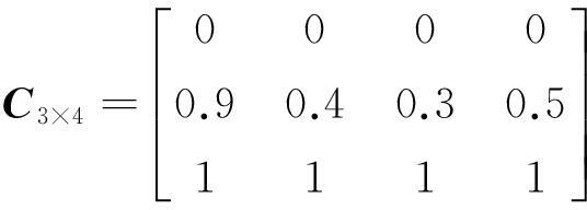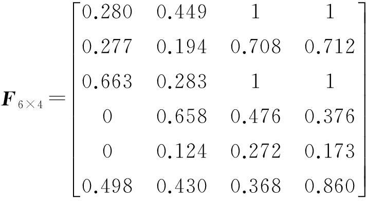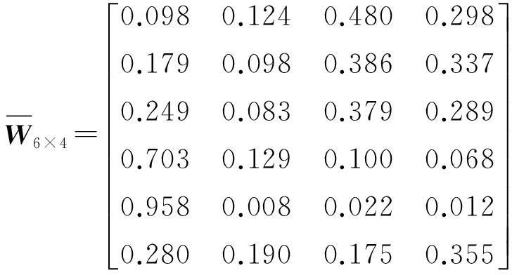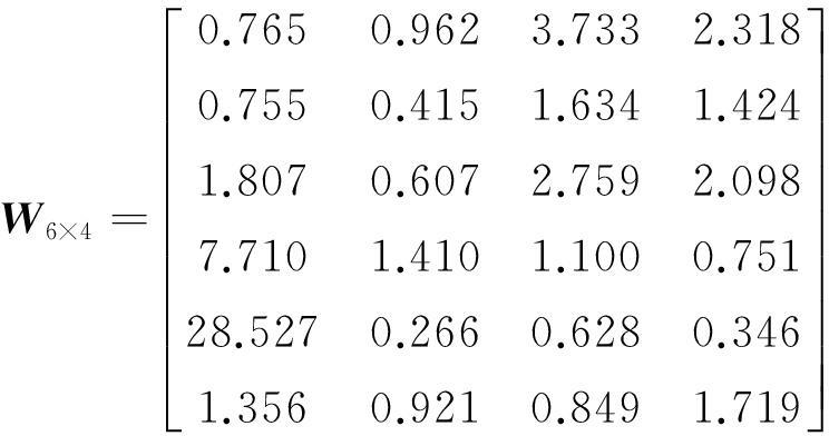 由式(9)得到6个评价对象、4个评价因子的权重矩阵: