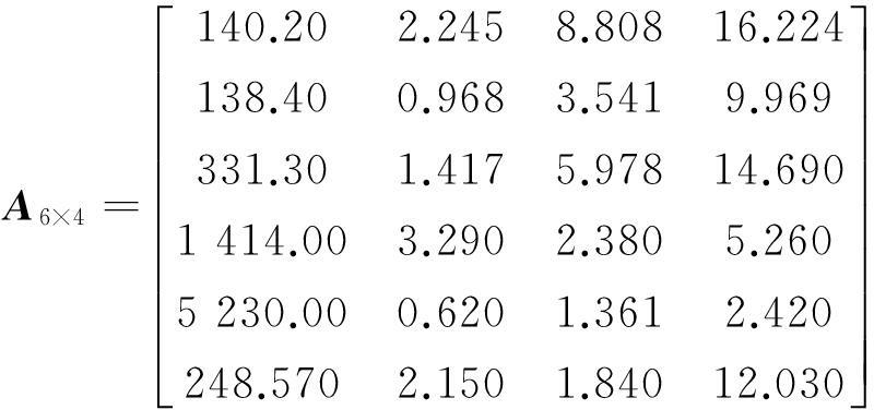 由式(3)可将实测数据矩阵A6×4转换为评价对象隶属度矩阵: