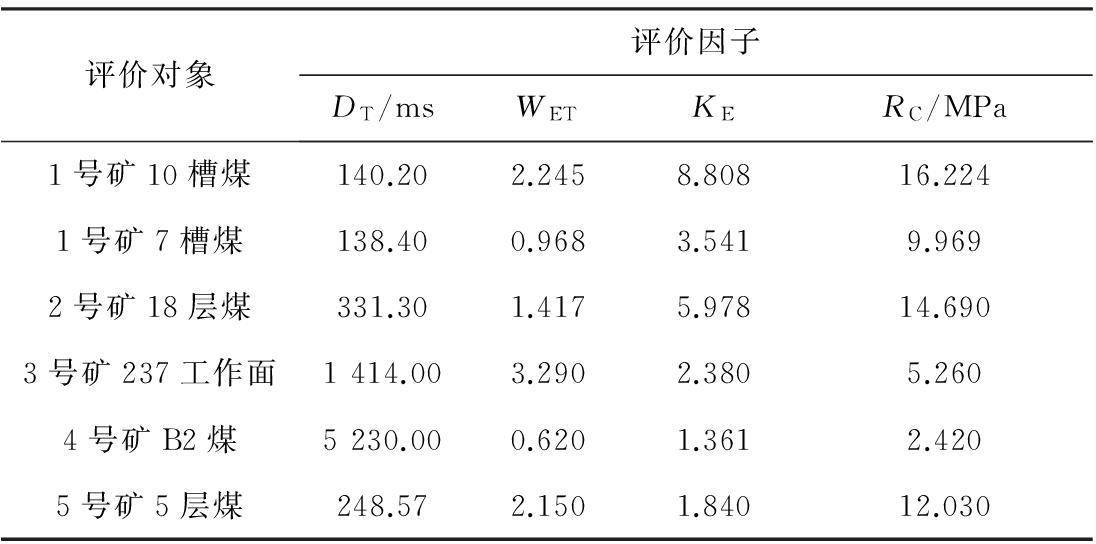 由表3知,1号矿7槽煤的冲击倾向性和5号矿5层煤的冲击倾向性都处于弱冲击倾向性(II),但二者对无冲击倾向性(I)的次贴进度分别为0.582和0.591。因此,1号矿7槽煤的冲击倾向性要弱于5号矿5层煤的冲击倾向性,且该结果与煤矿实际现场情况相符合。由此得到6种煤样的双指标评价结果: