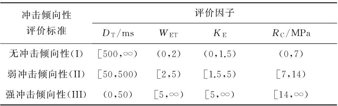 根据参考文献[2],选取动态破坏时间(DT)、弹性能量指数(WET)、冲击能量指数(KE)和单轴抗压强度(RC)作为煤岩冲击倾向性评价因子,根据评价结果将煤岩冲击倾向性分为无冲击倾向性(Ⅰ)、弱冲击倾向性(Ⅱ)、强冲击倾向性(Ⅲ)3类。各评价标准单因子模糊分级界限见表1。