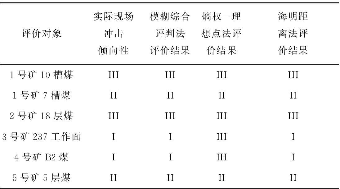 煤样的实际现场冲击倾向性与模糊综合评判法[7]、熵权-理想点法[8-9]、海明距离法的评价结果见表4。