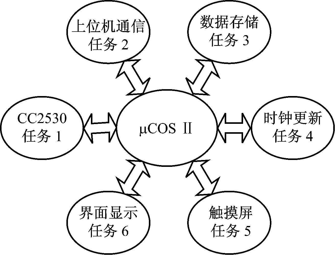 数据采集分站主要有2个功能:数据处理与向下通信。向下通信功能相当于把分站看成一个压力传感器节点,软件设计与节点相同。数据处理功能包括数据的汇总、存储、显示和转发。为了更好地运用STM32F103VET6单片机,在分站中嵌入了μCOS II实时操作系统,利用其优先级保证系统的实时处理能力,增强系统的可靠性。根据具体的功能要求设计了相对应的任务优先级,如图6所示。