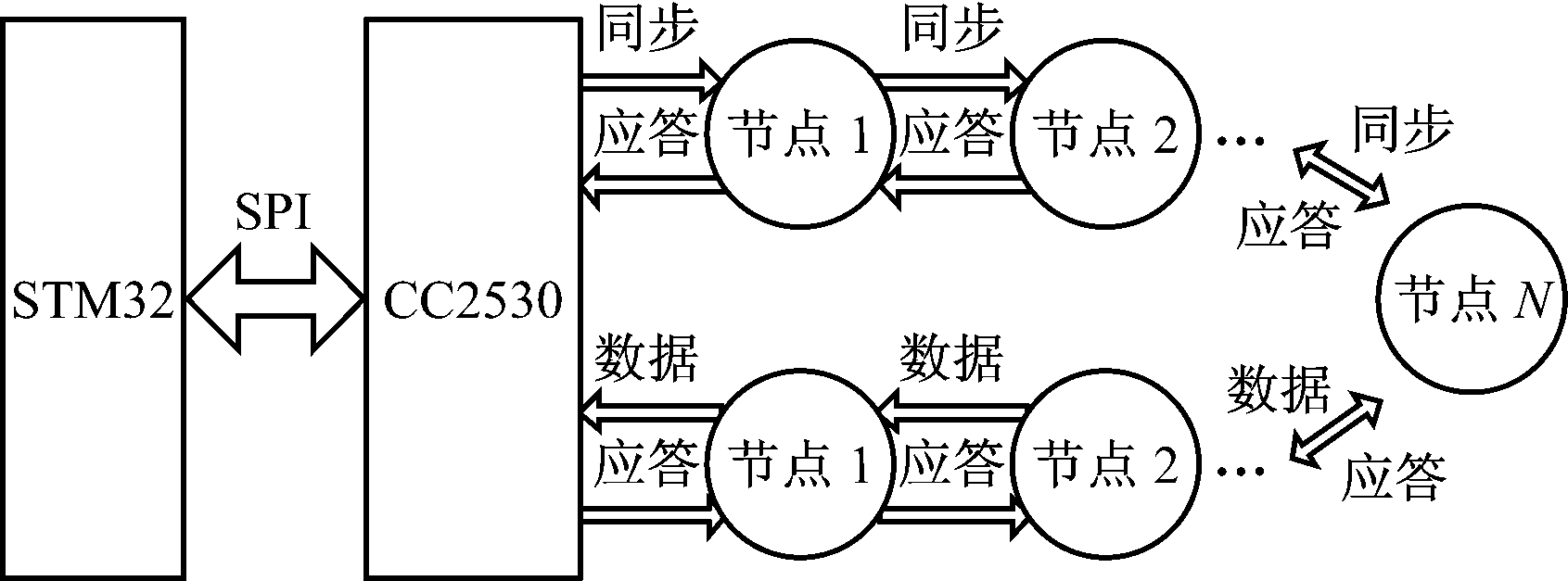 为了适应巷道的狭长特性,设计了一种基于ZigBee的线性接力传输方式。每个传感器节点都有唯一的地址[4],数据采集分站地址为0x0000,第1个节点地址为0x0001,依此类推。所有节点完成初始化后,同时进入等待接收同步时间的状态。数据采集分站发送时间同步命令给1号节点,1号节点收到命令后,给数据采集分站返回1个应答指令,确认已经收到同步时间命令,然后按照同步指令启动本地睡眠定时器,并将时间同步命令传给2号节点;2号节点采用与1号节点相同的流程,当1号节点收到2号节点的应答信息后,转移到等待接收2号节点数据的状态;然后,2号节点将同步指令发送给3号节点,依此类推,直到最后的N号节点,因为不存在N+1号节点,所以N号节点收不到应答信号。当发送10次同步信后若仍然无应答,则N号节点发送采集数据给N-1号节点,N-1号节点给N号节点应答信号后,N号节点进入睡眠状态。当N-1号节点收到N号节点的数据后,将自己采集的数据和N号节点的数据打包发送给N-2号节点,然后,依此类推,最后所有节点的数据都被打包发送到数据采集分站;数据采集分站将数据进行存储,完成本次通信。井下通信机制如图4所示。